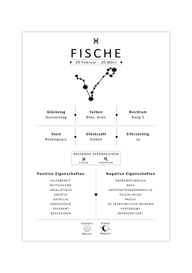 Hol dir dein Sternzeichen als Poster für deine Wand. Dieses Bild zeigt dir das Sternzeichen Fische mit Symbol, Glückszahl, Planeten, positiven und negativen Eigenschaften und den zu dir passenden Sternzeichen.